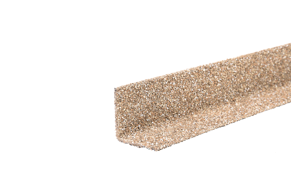 Уголок формируется из высококачественной стали и покрывается слоем алюмоцинка и акрилового грунта. На внешнюю сторону изделия для защиты и завершения эстетического вида наносится натуральная базальтовая посыпка.